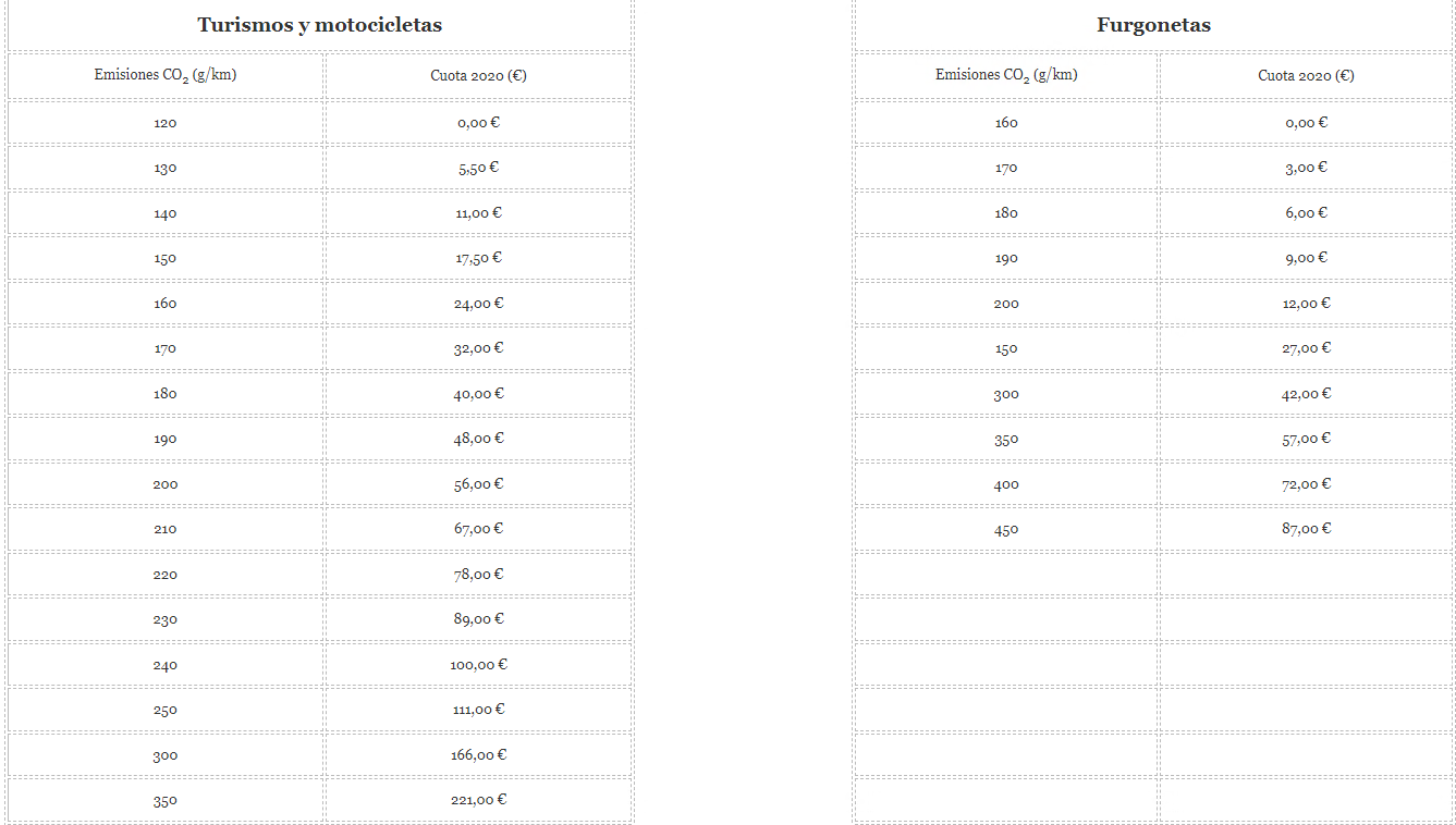 La Generalitat de Cataluña pone a disposición del contribuyente las siguientes cuotas a pagar en función de las emisiones de CO2 que emita el turismo, motocicleta o furgoneta en cuestión: