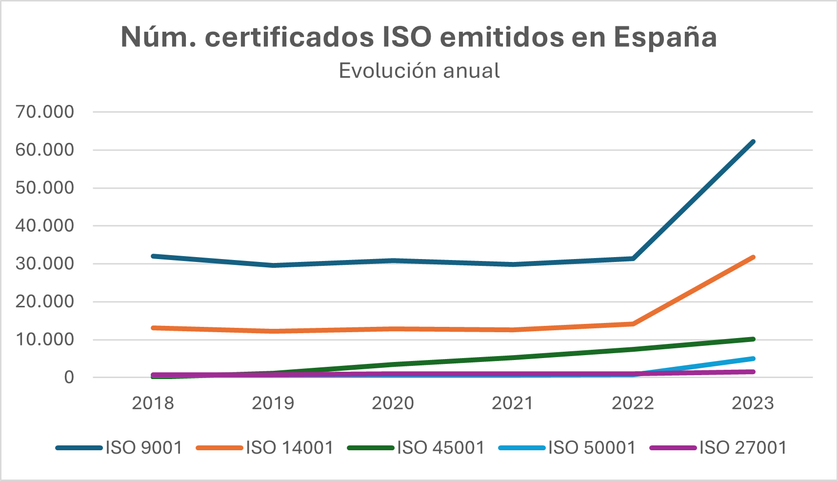 • En segundo lugar, se posiciona ISO 14001 (sistemas de gestión ambiental), modelo que ayuda a las organizaciones a mejorar su desempeño ambiental y a cumplir con las normativas vigentes. España cuenta con más de 31.000 certificados emitidos, cifra que representa un crecimiento espectacular respecto a 2021, año en el que se habían concedido más de 14.000 certificados. Este incremento seguramente viene motivado por el auge de la sostenibilidad y consolida a nuestro país en la tercera posición mundial.