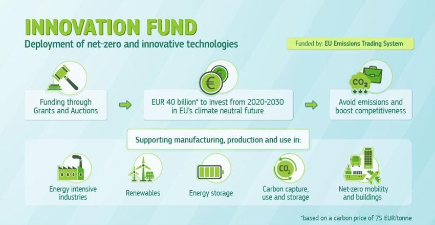 El Fondo de Innovación de la UE es un instrumento de financiación gestionado por la Comisión Europea, clave para cumplir los compromisos de descarbonización de la UE en virtud del Acuerdo de París y respaldar la visión estratégica de una Europa climáticamente neutra para 2050.