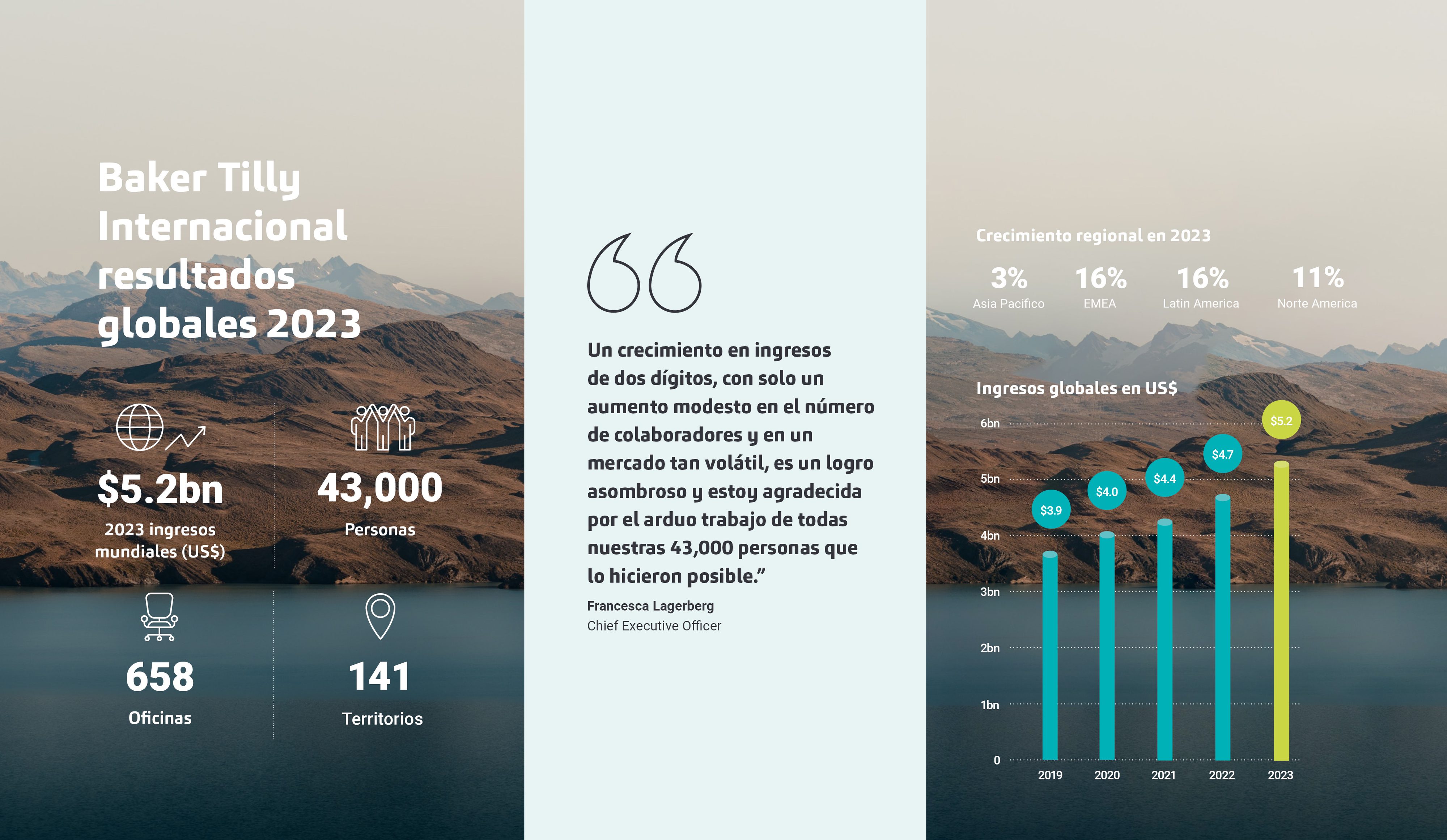 Francesca Lagerberg, CEO de Baker Tilly International, dijo: “Lograr un crecimiento de ingresos de dos dígitos, con un modesto aumento en el número de trabajadores/as y en un mercado tan volátil, es un logro increíble y estoy agradecida por el duro trabajo de nuestras 43,000 personas que lo hicieron posible. Superar la barrera de los 5.000 millones de dólares solo cuatro años después de alcanzar los 4.000 millones en ingresos, demuestra que somos una red internacional con verdadera ambición y empuje"