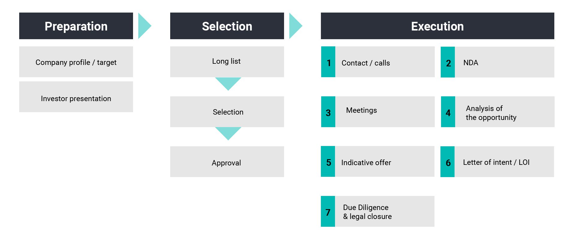 - During the process, asymmetric information must be managed and therefore requires a careful process of analysis and evaluation and verification through due diligence.