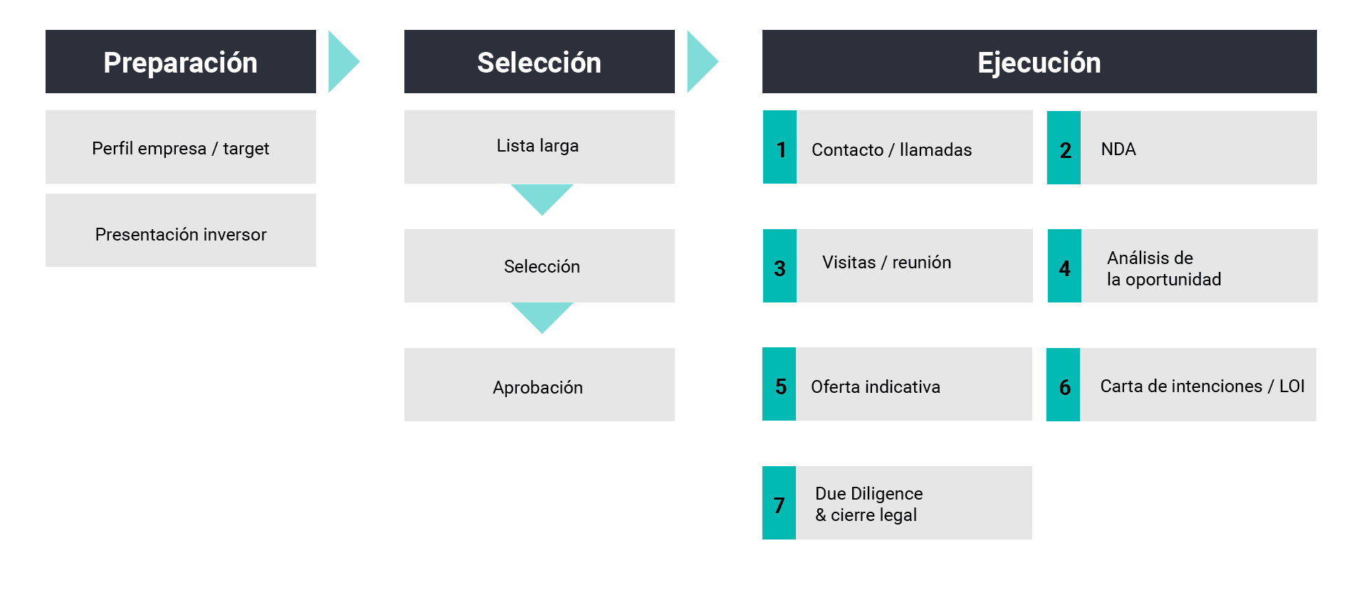 Se trata de un proceso que necesita de una investigación en profundidad centrada en los sectores en los que el inversor muestra interés; capacidad de negociación de un profesional con experiencia para conseguir un acuerdo justo; conocimientos de valoración, contratos de compraventa y pagos.